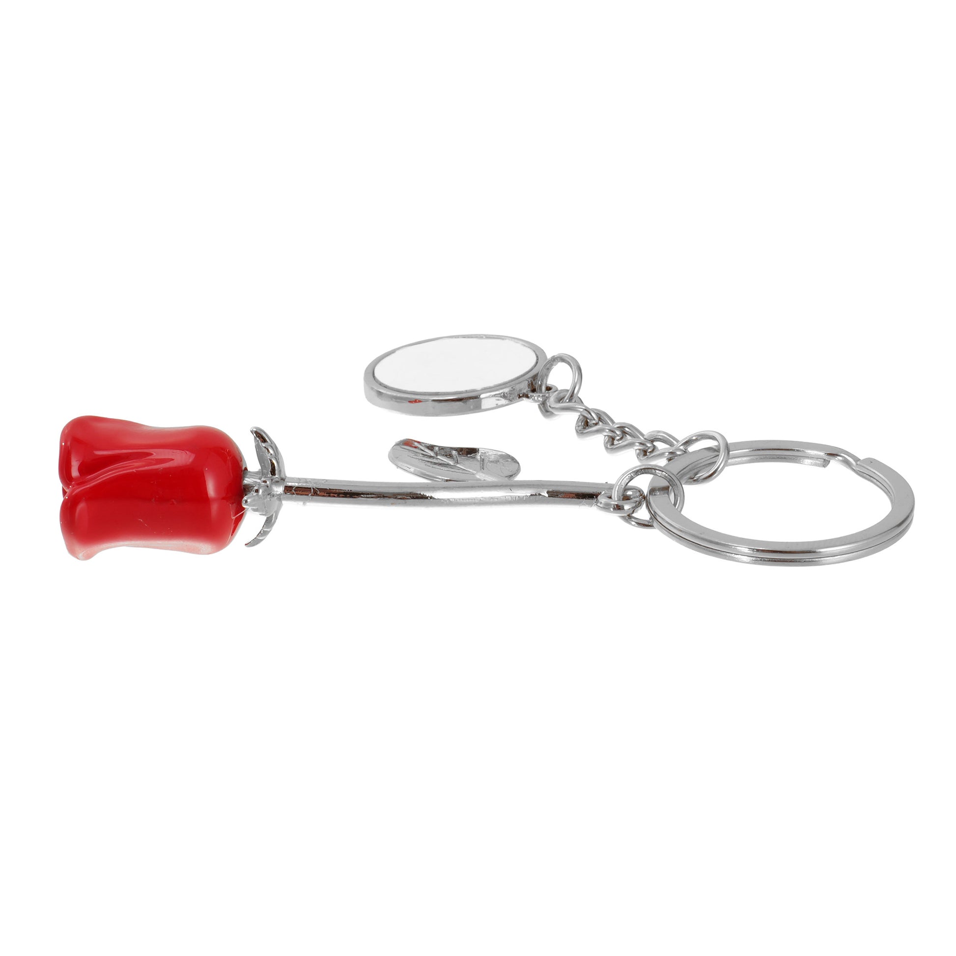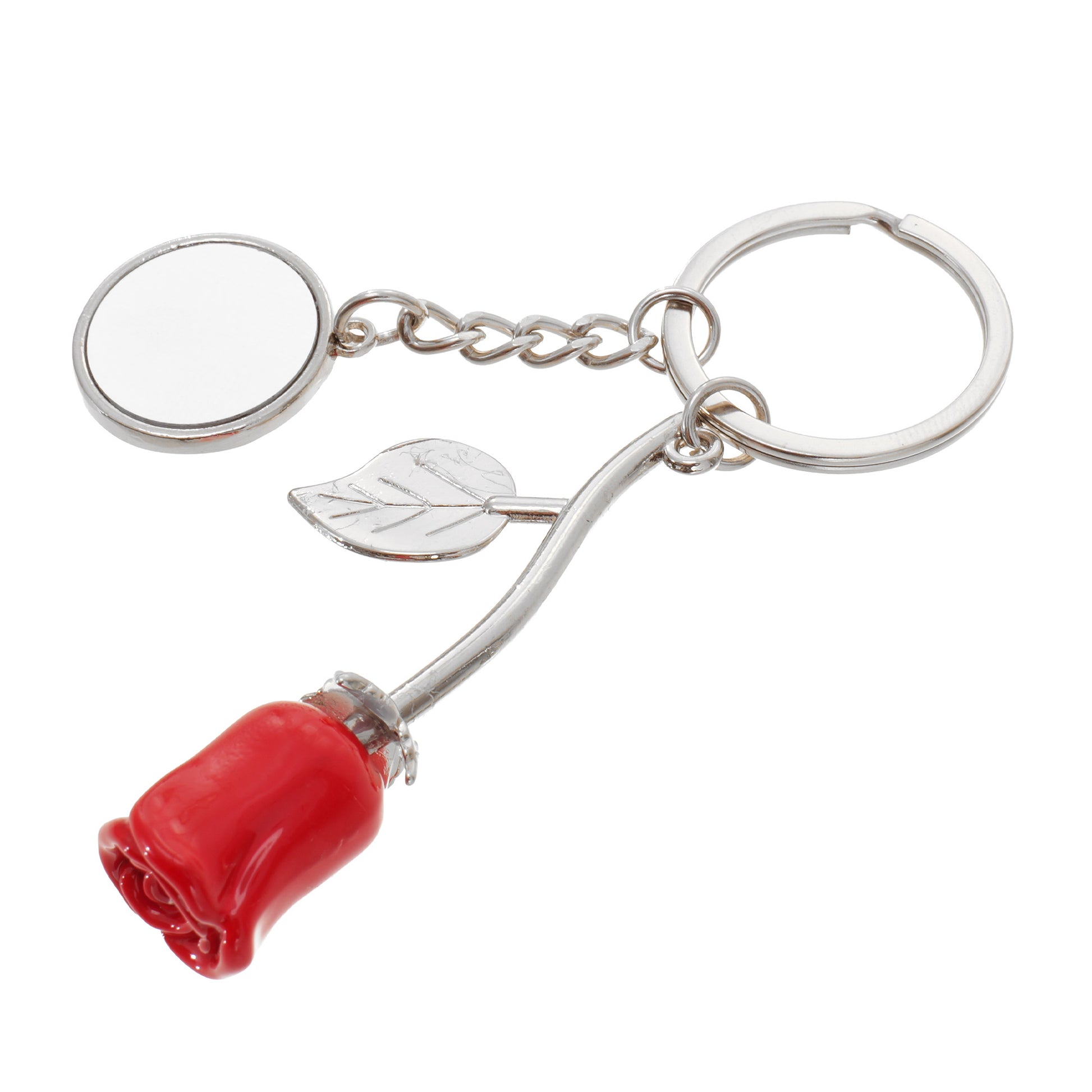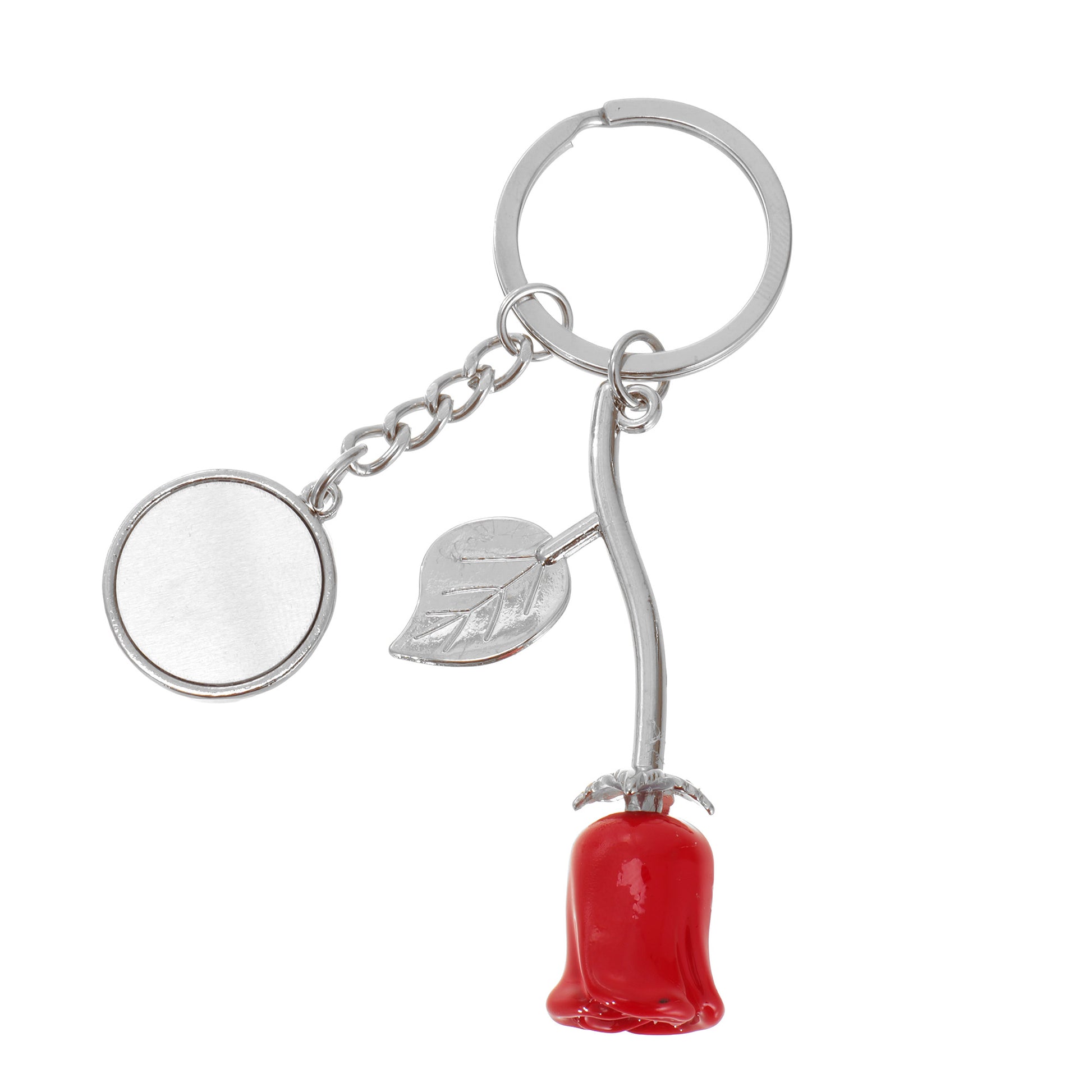 Breloc elegant, confecționat din metal argintiu lucios, decorat cu o floare tridimensională în formă de trandafir roșu. Este prevăzut cu o plăcuță rotundă destinată personalizării prin sublimare, gravură sau print UV.