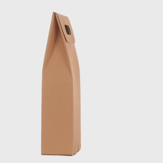 Кутия от твърд картон, снабдена с предно прозорче и изрязан дръжка, предназначена за опаковане и транспорт на бутилки. Продуктът се доставя сгънат и се сглобява бързо, ръчно, без нужда от инструменти.