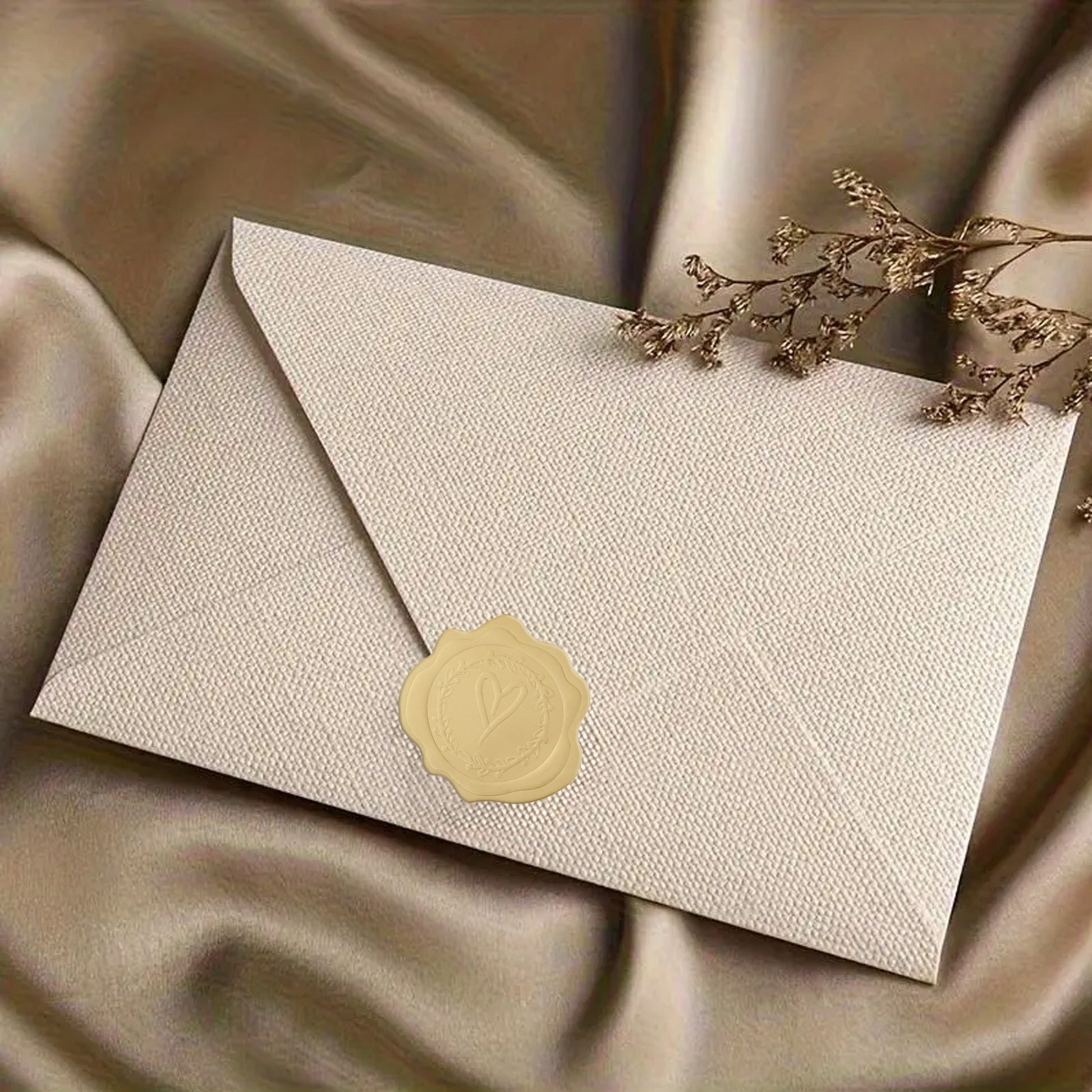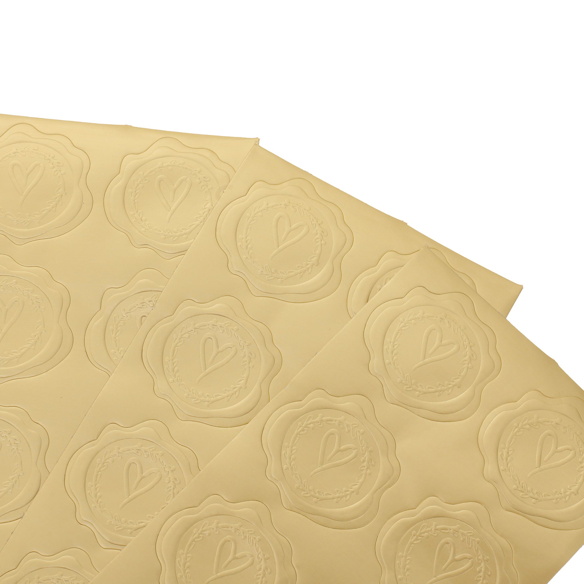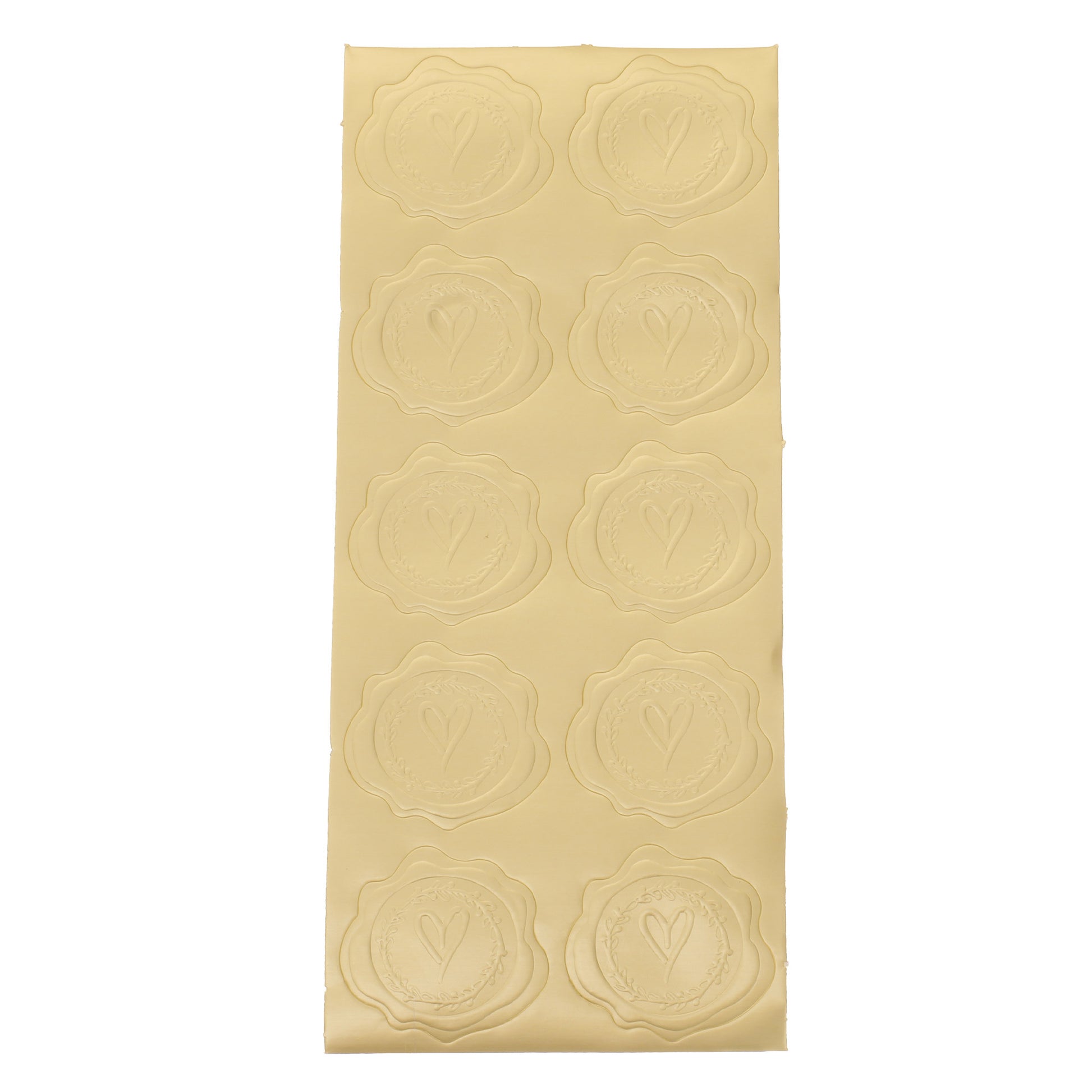 Декоративни стикери с вид на восъчен печат, идеални за придаване на елегантен и празничен вид на пликове, покани и опаковки за специални събития. Релефният дизайн с централно сърце и декоративна клонка ги прави перфектни за сватби, кръщенета, годишнини или други важни поводи.