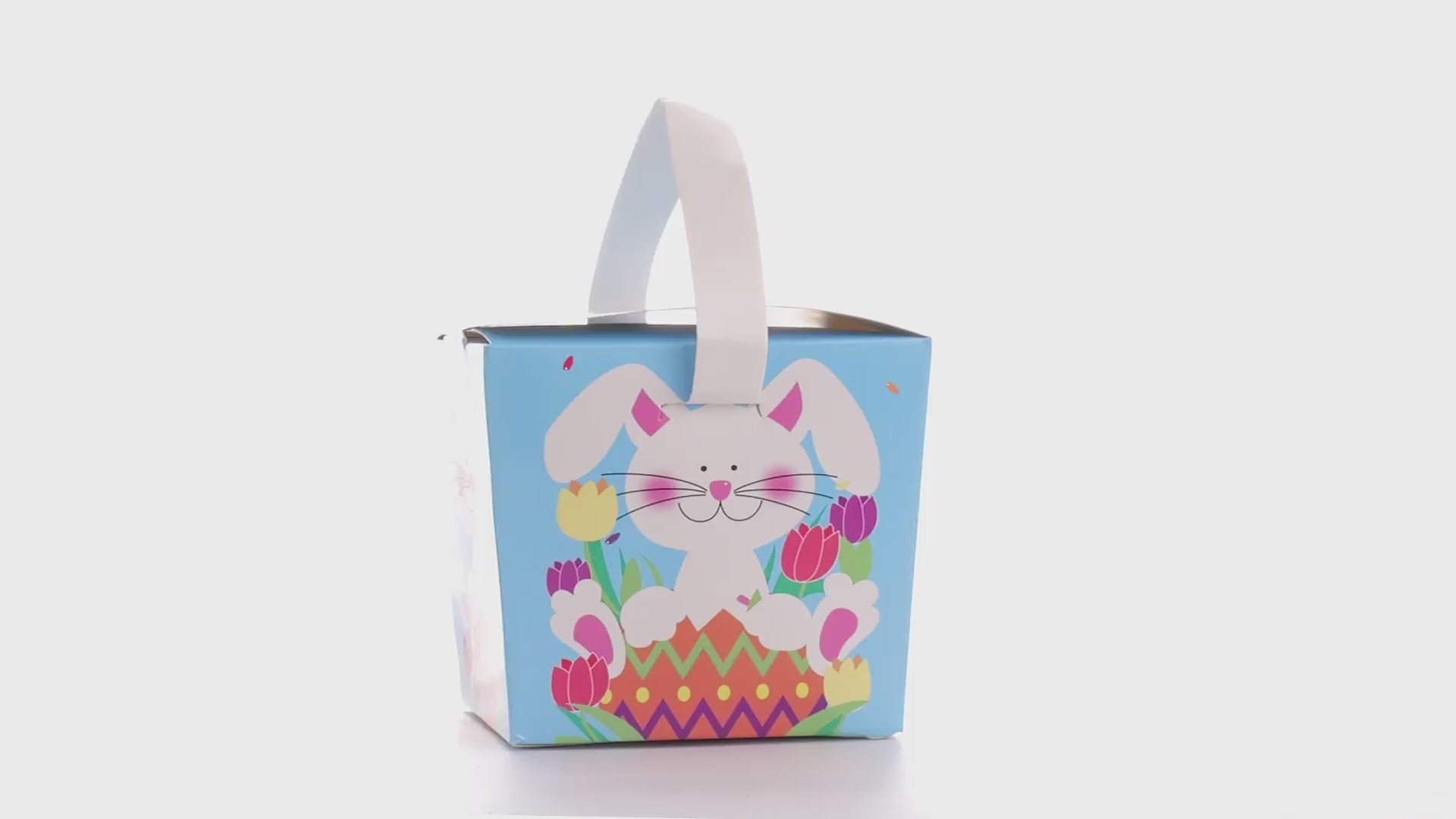 - Model tematic de Paste: Cutie decorata cu un iepuras in culori pastelate, potrivita pentru ambalarea canilor in perioada sarbatorilor de Paste.